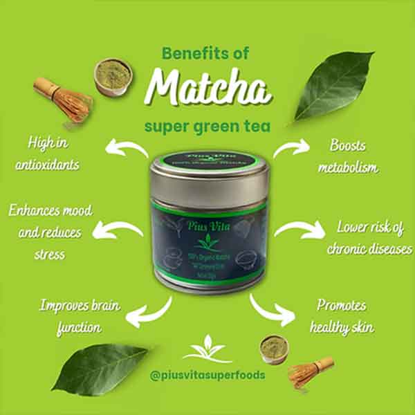 Pius Vita organic Matcha is packed with antioxidants including the powerful epigallocatechin gallate, it is known to boosts metabolism and burns calories, detoxifies effectively and naturally calms the mind, and relaxes the body.
